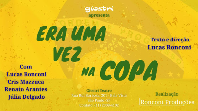 O ator Lucas Ronconi atua, dirige e produz peça de sua própria autoria que estreia dia 08 de dezembro no Giostri Teatro em curta temporada. O espetáculo fala sobre a Copa do Mundo.